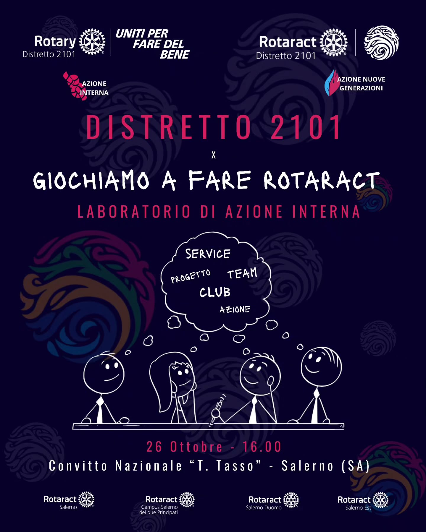 I Rotaract Club Salerno, Campus Salerno dei Due Principati, Salerno Duomo e Salerno Est unitamente al Rotaract Distretto 2101 sono felici di invitarvi a Distretto 2101 x Giochiamo a fare Rotaract, incontro di Azione Interna Distrettuale, interamente dedicato alla nascita di nuove idee e alla condivisione di buone pratiche.